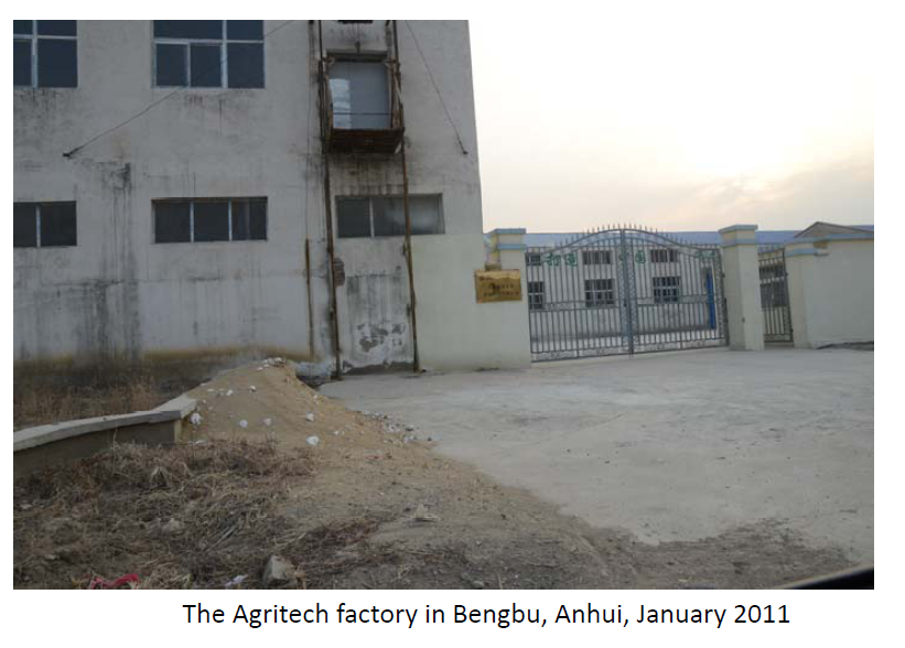 In Anhui, which Agritech calls its principal production facility, $400,000 worth of plant and equipment would seem slim for 100,000 tons of production capacity. We visited and found a small plant on a rutted road outside Bengbu, completely deserted.
